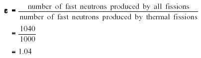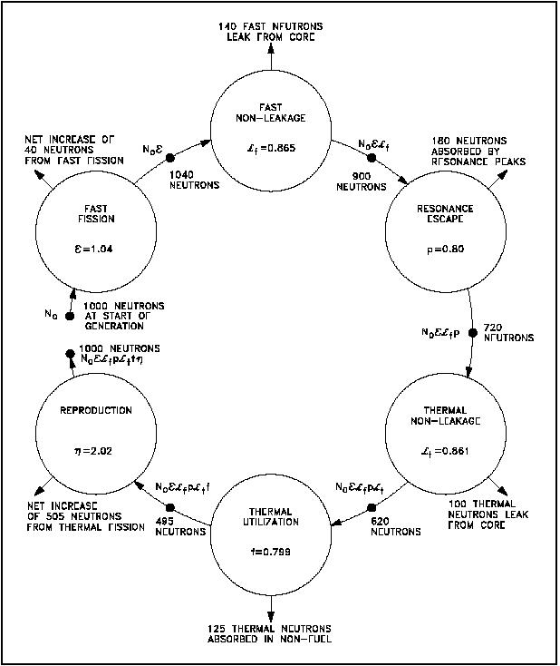 represented by the quantity In the example illustrated in Figure 1, keff is equal to one. available to start the next generation. Therefore, 1000 neutrons are Example: 10,000 neutrons exist at the beginning of a generation. The values for each factor of the six factor formula are listed below. Calculate the number of neutrons that exist at the points in the neutron life cycle listed below. 1) Number of neutrons that exist after fast fission. 2) Number of neutrons that start to slow down in the reactor. 3) Number of neutrons that reach thermal energies. 4) Number of thermal neutrons that are absorbed in the reactor. 5) Number of thermal neutrons absorbed in the fuel. 6) Number of neutrons produced from thermal fission.