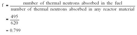 represented by the quantity Figure 1 indicates that 125 neutrons were absorbed in non-fuel materials. Since a total of 620 thermal neutrons were absorbed, the number absorbed by the fuel equals 620 - 125 = 495. Therefore, the thermal utilization factor can be calculated as follows.