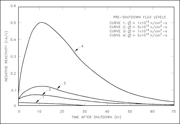 Figure 5 Xenon-135 Reactivity After Reactor Shutdown Negative xenon reactivity, also called xenon poisoning, may provide sufficient negative reactivity to make the reactor inoperable because there is insufficient positive reactivity available from control rod removal or chemical shim dilution (if used) to counteract it. The inability of the reactor to be started due to the effects of xenon is sometimes referred to as a xenon precluded startup. The period of time where the reactor is unable to "override" the effects of xenon is called xenon dead time. Because the amount of excess core reactivity available to override the negative reactivity of the xenon is usually less than 10% Ok/k, thermal power reactors are normally limited to flux levels of about 5 x 1013 neutrons/cm2-sec so that timely restart can be ensured after shutdown. For reactors with very low thermal flux levels (-5 x 1012 neutrons/cm2-sec or less), most xenon is removed by decay as opposed to neutron absorption. For these cases, reactor shutdown does not cause any xenon-135 peaking effect. Following the peak in xenon-135 concentration about 10 hours after shutdown, the xenon-135 concentration will decrease at a rate controlled by the decay of iodine-135 into xenon-135 and the decay rate of xenon-135. For some reactors, the xenon-135 concentration about 20 hours after shutdown from full power will be the same as the equilibrium xenon-135 concentration at full power. About 3 days after shutdown, the xenon-135 concentration will have decreased to a small percentage of its pre-shutdown level, and the reactor can be assumed to be xenon free without a significant error introduced into reactivity calculations. Xenon-135 Oscillations Large thermal reactors with little flux coupling between regions may experience spatial power oscillations because of the non-uniform presence of xenon-135. The mechanism is described in the following four steps. An initial lack of symmetry in the core power distribution (for example, individual control rod movement or misalignment) causes an imbalance in fission rates within the reactor core, and therefore, in the iodine-135 buildup and the xenon-135 absorption. (2) In the high-flux region, xenon-135 burnout allows the flux to increase further, while in the low-flux region, the increase in xenon-135 causes a further reduction in flux. The iodine concentration increases where the flux is high and decreases where the flux is low. As soon as the iodine-135 levels build up sufficiently, decay to xenon reverses the initial situation. Flux decreases in this area, and the former low-flux region increases in power. (4) Repetition of these patterns can lead to xenon oscillations moving about the core with periods on the order of about 15 hours. With little change in overall power level, these oscillations can change the local power levels by a factor of three or more. In a reactor system with strongly negative temperature coefficients, the xenon-135 oscillations are damped quite readily. This is one reason for designing reactors to have negative moderator-temperature coefficients. |
