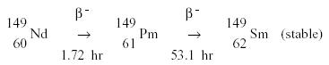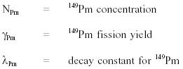 For the purpose of examining the behavior of samarium-149, the 1.73 hour half-life of neodymium-149 is sufficiently shorter than the 53.1 hour value for promethium-149 that the promethium-149 may be considered as if it were formed directly from fission. This assumption, and neglecting the small amount of promethium bunup, allows the situation to be described as follows. Rate of change of 149pM = yield from fission - decay 149pM concentration therefore: