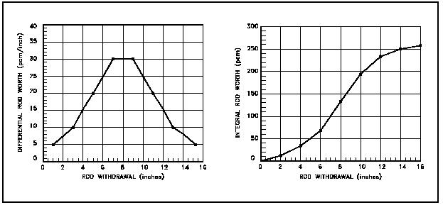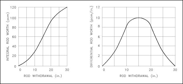 Figure 12 Rod Worth Curves From Example 3 If an integral rod worth curve is supplied, a differential rod worth curve can be generated from the integral rod worth data. Merely select a convenient interval of rod withdrawal, such as 1 inch or 2 inches. Then, determine from the curve the amount of reactivity added for each constant interval of rod withdrawal.A plot of this reactivity addition versus rod withdrawal represents differential rod worth. |