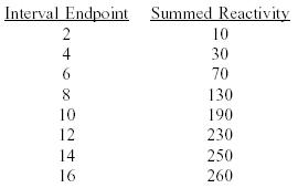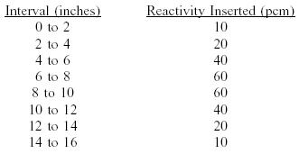 Solution: Differential rod worth: For each interval, the number of pcm/inch must be determined. For example, in the first interval (0 inches to 2 inches), 10 pcm is added. Therefore, the differential rod worth equals an average 5 pcm/inch. This value of differential rod worth is plotted at the center of each interval. The center of the interval 0 inches to 2 inches is 1 inch. The values of pcm/inch for each interval are then listed as shown below and plotted on Figure 12.