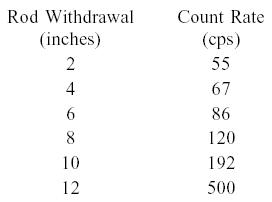 In practice, the reference count rate used is the count rate prior to the beginning of the reactivity change. The startup procedures for many reactors include instructions to insert positive reactivity in incremental steps with delays between the reactivity insertions to allow time for subcritical multiplication to increase the steady-state neutron population to a new, higher level and allow more accurate plotting of 1/M. The neutron population will typically reach its new steady-state value within 1-2 minutes, but the closer the reactor is to criticality, the longer the time will be to stabilize the neutron population. Example: Given the following rod withdrawal data, construct a 1/M plot and estimate the rod position when criticality would occur. The initial count rate on the nuclear instrumentation prior to rod withdrawal is 50 cps.