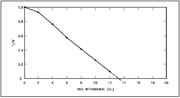 Step 2:Plotting these values, as shown in Figure 1, and extrapolating to a 1/M value of 0 reveals that the reactor will go critical at approximately 13 inches of rod withdrawal.