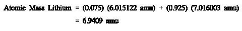 Abundance of Isotopes The relative abundance of an isotope in nature compared to other isotopes of the same element is relatively constant. The Chart of the Nuclides presents the relative abundance of the naturally occurring isotopes of an element in units of atom percent. Atom percent is the percentage of the atoms of an element that are of a particular isotope. Atom percent is abbreviated as a/o. For example, if a cup of water contains 8.23 x 1024 atoms of oxygen, and the isotopic abundance of oxygen-18 is 0.20%, then there are 1.65 x 1022 atoms of oxygen-18 in the cup. The atomic weight for an element is defined as the average atomic weight of the isotopes of the element. The atomic weight for an element can be calculated by summing the products of the isotopic abundance of the isotope with the atomic mass of the isotope. Example: Calculate the atomic weight for the element lithium. Lithium-6 has an atom percent abundance of 7.5% and an atomic mass of 6.015122 amu. Lithium-7 has an atomic abundance of 92.5% and an atomic mass of 7.016003 amu. Solution:
