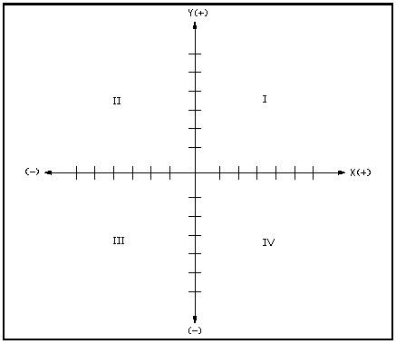 Figure 3 Rectangular Coordinate System The rectangular coordinate system creates four infinite quadrants. Quadrant I is located above and to the right of the origin. Quadrant II is located above and to the left of the origin. Quadrant III is situated to the left and below the origin, and quadrant IV is located below and to the right of the origin (see Figure 3). |