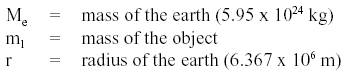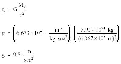 Using this universal law of gravitation, we can determine the value of g (gravitational acceleration constant), at the surface of the earth. We already know this value to be 9.8 m/sec2 (or 32.17 ft/sec2), but it can be calculated using Equation 3-2. Calculation: First, we will assume that the earth is much larger than the object and that the object resides on the surface of the earth; therefore, the value of r will be equal to the radius of the earth. Second, we must understand that the force of attraction (F) in Equation 3-2 for the object is equal to the object's weight (F) as described in Equation 3.1. Setting these two equations equal to each other yields the following.