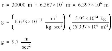 As you can see, a height of 30 km only changes (g) from 9.8 m/sec2 to 9.7 m/sec2. There will be an even smaller change for objects closer to the earth. Therefore, (g) is normally considered a constant value since most calculations involve objects close to the surface of the earth. |