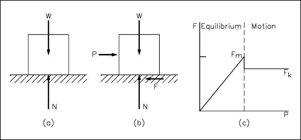 In discussing the types of forces, a simple rule is used to determine if the force is a tensile or a compressive force. If an applied force on a member tends to pull the member apart, it is said to be in tension. If a force tends to compress the member, it is in compression. It should also be mentioned that ropes, cables, etc., that are attached to bodies can only support tensile loads, and therefore such objects are in tension when placed on the free-body diagram. In addition, when a fluid is involved, it should be understood that fluid forces are almost always compressive forces. Friction Another type of force often used in classical physics is the force resulting from two surfaces in contact, where one of the surfaces is attempting to move parallel to or over the other surface. Such forces are referred to as friction forces. There are two types of friction forces: those due to dry friction, sometimes called Coulomb friction, and those resulting from fluid friction. Fluid friction develops between layers of fluid moving at different velocities. This type of frictional force is used in considering problems involving the flow of fluids through pipes. Such problems are covered in the Fundamentals Manual on fluid flow. In this section, problems involving rigid bodies which are in contact along dry surfaces are considered. The laws of dry friction are best understood by the following experiment. A block of weight W is placed on a horizontal plane surface (see Figure 9). The forces acting on the block are its weight W and the normal force N of the surface. Since the weight has no horizontal component, the normal force of the surface also has no horizontal component; the reaction is therefore normal to the surface and is represented by N in part (a) of the figure. Suppose now, that a horizontal force P is applied to the block (see part (b)). If P is small, the block will not move. Some other horizontal force must therefore exist which balances P. This other force is the static-friction force F, which is actually the resultant of a great number of forces acting over the entire surface of contact between the block and the plane. The nature of these forces is not known exactly, but it is generally assumed that these forces are due to the irregularities of the surfaces in contact and also to molecular action.