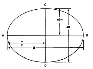 Figure 1-15.-Ellipse. explained in chapter 3. An ellipse is shown in figure 1-15, The longer axis, AB, is called the major axis, and the shorter axis, CD, the minor axis. Call the length of the major axis a and that of the minor axis b. The area equals the product of half the major axis times half the minor axis times p. In formula form, it is stated as
