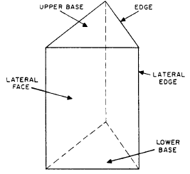 Figure 1-17.-Parts of a prism (triangular). a solid. For example, three rectangles and two triangles may be combined as shown in figure 1-17. The flat surfaces of the solid figure are its FACES, the top and bottom faces are the BASES, and the faces forming the sides are the LATERAL FACES or SURFACES. Some solid figures do not have any flat faces, and some have a combination of curved surfaces and flat surfaces. Examples of solids with curved surfaces include cylinders, cones, and spheres. Those solids having no flat faces include a great majority of natural objects, such as rocks, living matter, and many other objects that have irregular surfaces. A solid figure whose bases or ends are similar, equal, and parallel polygons, and whose faces are parallelograms, is known geometrically as a PRISM. The name of a prism depends upon its base polygons. If the bases are triangles, as in figure 1-17, the figure is a TRIANGULAR PRISM. A RECTANGULAR PRISM has bases that are rectangles, as shown in figure 1-18. If the bases of a prism are perpendicular to the planes forming its lateral faces, the prism is a RIGHT prism. A PARALLELEPIPED is a prism with parallelograms for bases. Since the bases are parallel to each other, this means that they cut the lateral faces to form parallelograms. If a parallelepipeds is a right prism and if its bases are rectangles, it is a rectangular solid. A CUBE is a rectangular solid in which all of the six rectangular faces are squares.