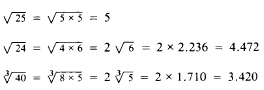 Any radical expression has a decimal equivalent, which may be exact if the radicand is a rational number. If the radicand is not rational, the root may be expressed as a decimal approximation, but it can never be exact. A procedure similar to long division may be used for calculating square root. Cube root and higher roots may be calculated by methods based on logarithms and higher mathematics. Tables of powers and roots have been calculated for use in those scientific fields in which it is frequently necessary to work with roots. Such tables may be found in appendix I of Mathematics, Vol. 1, NAVEDTRA 10069-D 1, and in Surveying Tables and Graphs, Army TM 5-236. This method is, however, slowly being phased out and being replaced by the use of hand-held scientific calculators. |