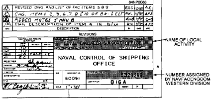 Figure 10-2.-A title block showing a drawing number assigned by NAVFACENGCOM. (Figure 10-2 is an example of a local activity, such as the Civil Engineering Support Office (CESO), using a drawing number assigned by the Western (WESTDIV).)Figure 10-2.A title block showing a number assigned by NAVFACENGCOM. You may not use a NAVFACENGCOM number for any other drawing, even though the drawing to which it has been assigned is not being used. Sometimes, because of extensive revision on a particular drawing, it becomes necessary to prepare a new drawing and to assign a new NAVFACENGCOM drawing number. A cross-reference note to be placed directly above or adjacent to the title block is shown below.Old Drawing Note: THIS DRAWING SUPERSEDED BY DRAWING NO._______New Drawing Note: THIS DRAWING SUPER-SEDES DRAWING NO. _______Drawing Revisions Revisions to NAVFACENGCOM project drawings are to be made according to DOD-STD-100C. The revision block may include a separate "PREPARED BY" column to indicate the organization, such as an A/E firm, that prepared the revision. The layout of the modified revision block is to be as shown in chapter 3, figure 3-22, views A and B. Graphic Scales Graphic scales are located in the lower right-hand corner of each drawing sheet, with the words Graphic Scales directly over them. The correct graphic scales must be shown prominently on each drawing because, as drawings are reduced in size, the reductions are often NOT to scaled proportions.Line Conventions and Lettering You should pay close attention to the opaqueness and uniform weight of lines. To provide contrasting division and use of thick and thin lines, refer to chapter 3, figure 3-23, and ANSI Y14.2M, Line Conventions and Lettering, Engineering Drawing and Related Documentation Practices. where lowercase lettering may be used. The minimum allowable height of freehand letters is 5/32 (0.156) in., and of mechanical or computer graphics is 0.150 in. For abbreviations on drawings, use MIL-STD-12, Abbreviations. |