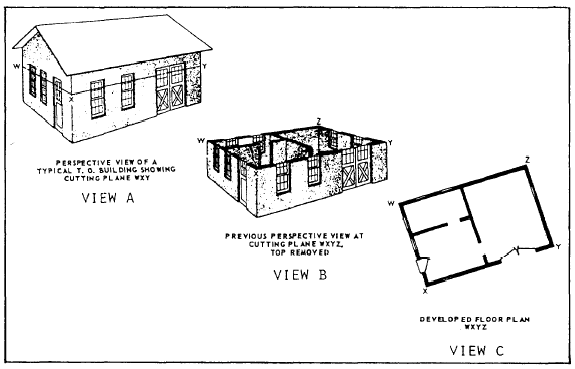 Figure 10-12.-Development of a floor plan. building has been constructed, a cutting plane is used and cuts through the structure passing through the plane WXYZ (view A) and that the upper portion has been removed (view B). You would then be able to look down on the floor from above, and the drawing of what you see would be the floor plan (view C).Figure 10-13 shows a floor plan of a concrete-masonry construction. It gives the lengths, thicknesses, and character of the outside walls and partitions at the particular floor level. It also shows the dimensions and arrangement of the rooms, the widths and locations of the doors and windows, and the locations and character of the rest rooms and other utility features. Study figure 10-13 carefully! |