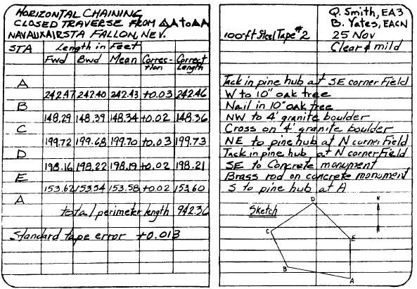 Preparing Chaining Notes Before discussing the subject of chaining notes, we will mention a few general principles applicable to all types of field notes. It goes without saying that it is essential that measurements and other data be accurately recorded and that any additional information required to identify and clarify the data be included. Field notes are required to be legible as well as accurate. If you dont write or print legibly, you will have to improve your script. All notes should be recorded in pencil; a 3H or 4H pencil is best for the job. A pencil that is too soft blunts too quickly; one that is too hard makes a faint mark and scores the paper. In the field, you need to carry a pocketknife or pocket pencil sharpener to keep your pencil sharpened or pointed. There is a general rule to the effect that erasures are not permitted in field notes. Suppose that in the course of chaining several intervals you make a 10-ft "bust" in one of the intervals by misreading 10 ft as 20 ft. After you total up the distance, some circumstance leads you to suspect that the total is off. You recheck the work and discover where you made the bust. The notebook record for that interval must be changed. You make the change by crossing out the wrong entries and entering the correct ones above themnot by erasing the wrong entries. RECORDING NOTES FOR HORIZONTAL CHAINING. A typical example of a horizontal chaining conducted for a closed traverse is shown in figure 12-16. The chaining party started at station A and chained around by way of B, C, and so on. Arriving back at A, the party reversed its direction and chained back around by way of E, D, C, and so on, as a check. The distance finally recorded for each traverse line was the mean (average) between the forward measurement and the backward measurement.Note on the bottom left-hand side the fact that the tape had a standard error of 0.013 ft per 100 ft of tape. The error is marked " + ," meaning that the amount of error should be added to the measurement as indicated by the tape. Obviously, the tape was reading short. The corrections in the "Correction" column indicate that only correction for standard error