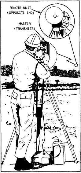 Measuring by Microwave Devices The microwave distance-measuring device (fig. 12-23) is an electronic instrument that transmits precisely controlled RADIO WAVES between two units. The waves are compared and electronically changed into a visually readable form from which the distance between the units can be computed. As shown in figure 12-24, the unit that originates and transmits the modulated radio waves is called the master. The unit at the opposite end of the line from the master is known as the remote. The two are identical instruments, each being adaptable to use as either master or remote. At the remote unit, the original transmission is received, interpreted, and put on a new
