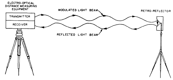 Figure 12-27.-Typical configuration of a light wave distance-measuring device. As a rule, field crew members should be familiar with the telephone number and location of the nearest hospital or dispensary their party will be operating, should have a transport vehicle available and ready, and should have valid government vehicle operators licenses. In addition, a first-aid kit should be kept handy at all times. |