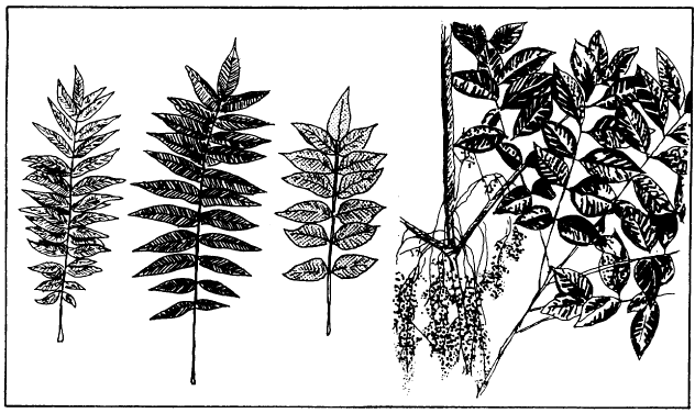 Figure 12-30.-Varieties of sumac leaves. away from your body and take care that you do not injure others with it. When working near other people, carry your range poles or level rods vertically against your body so that another persons head or eyes will not be injured if you turn suddenly. Do not hold a stake or bull-point with your hand around the shank while another person is driving it with a sledgehammer. Do not let a tape or plumb bob cord slide fast through your hands. Always use tools correctly and for the purpose for which they are intended. For example, when cutting brush near the ground with a machete, swing it away from your legs and feet. Never cut at short range from your body. Be sure that the radius of your swing is clear of obstructions, such as vines or twigs, that might deflect the intended direction of the swing. Use your full arms length to get a safe-swing radius. Always work at least 10 ft away from the nearest person. If it is necessary to use an ax to clear an area, you can prevent painful blisters by wearing a pair of thin gloves. Above all, use common sense and consider the possible results of your actions. To climb poles and trees safely, it is best to use authorized climbing equipment. A linemans pole climbers are made of steel and have a strap loop and short spur. Tree climbers have straps, pads for protection against friction, and a longer spur for penetrating bark. To avoid falling, use both belt and straps. Except in an emergency, never work in or on trees during a high wind. Watch out for power lines that may be in contact with the tree you are climbing. Burning operations should always be con-ducted in the clear, where the fire will not ignite tree leaves or limbs, dry wooded areas, or nearby buildings. Remember that it is imperative that all burning or smoldering material be completely extinguished before it is left unattended. When practicable, use only nonflammable solvents for cleaning instruments. Do not leave the caps off or the stoppers out of flammable liquid containers. Use solvents only in a well-ventilated location. All of the above could be boiled down to this: |