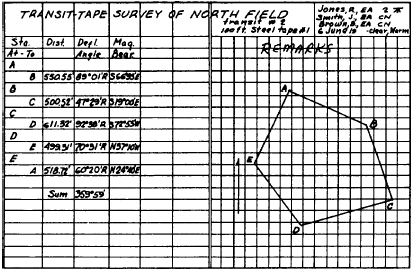 Figure 13-12.-Sample field notes from a deflection angle transit-tape survey. 2. Read the vernier with the eye directly over the top of the coinciding graduations to eliminate the effects of parallax.3. Take the reading of the other vernier as a check. The readings should be 180 apart.4. Check the plate bubbles before measuring an angle to see if they are centered, but do not disturb the leveling screws between the initial and final settings of the line of sight. If an angle is measured again, the plate may be releveled after each reading before sighting again on the starting point.5. Make sure that the rodman is holding the range pole truly vertical when you sight at it. When the bottom of the range pole is not visible, let the rodman use a plumb bob.6. Avoid accidental movement of the horizontal circle; for instance, moving the wrong clamp or tangent screw. If a number of angles will be observed from one setup without moving the horizontal circle, you should sight at some clearly defined distant object that will serve as a reference mark and take note of the angle. Occasionally, you should recheck the reading to this point during measurement to see if there is any accidental movement.An example of a horizontal deflection angle measurement is shown in figure 13-12. The field notes contain data taken from a loop traverse shown in the sketch. The transit was first set up at station A, and the magnetic bearing of AB was read on the compass. Then the deflection angle between the extension of EA and AB was turned in the following manner:1. The instrumentman released both clamps, matched the vernier to zero by hand, tightened the upper motion clamp, and set the zero exactly with the upper tangent screw.2. With the telescope plunged (inverted position), the instrumentman sighted the range pole held on station E. Then he tightened the lower motion clamp and manipulated the lower motion tangent screw to bring the vertical cross hair to exact alignment with the range pole.3. The instrumentman replunged the telescope and trained on the extension of EA. (Notice that the telescope is in its normal position now.) He then released the upper motion and rotated the telescope to the right until the vertical cross hair came into line with the range pole held on station B. He further set the upper motion clamp screw and brought the vertical cross hair into exact alignment with the range pole by manipulating the upper motion tangent screw.4. The instrumentman then read the size of the deflection angle on the A vernier (8901). Since the angle was turned to the right, he recorded 8901R in the column headed "Defl. Angle." Likewise, he recorded the chained distance between stations A and B and the magnetic bearing of traverse line AB under their appropriate headings.