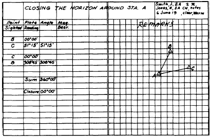 Figure 13-13.-Sample field notes for closing the horizon. The instrumentman used the same method at each traverse station, working clockwise around the traverse to station E. Note that the algebraic sum of the measured deflection angle (angles to the right considered as plus, to the left as minus) is 35059. For a closed traverse, the algebraic sum of the deflection angles from the standpoint of pure geometry is 36000. Therefore, there is an ANGULAR ERROR OF CLOSURE here of 001. This small error would probably be considered a normal error. A large variance would indicate a larger mistake made in the measurements. In the example just presented, the general accuracy of all the angular measurements was checked by comparing the sum of the deflection angles with the theoretical sum. The accuracy of single angular measurement can be checked by the, procedure CLOSING THE HORIZON. The method is based on the fact that the theoretical sum of all the angles around a point is 36000. The field notes in figure 13-13 show the procedure for closing the horizon. The transit was set up at station A, and angle BAC was turned, measuring 5115. Then the angle from AC clockwise around to AB was turned, measuring 30845. The sum of the two angles is 36000. The angular error of closure is therefore 000, meaning that perfect closure is obtained. |