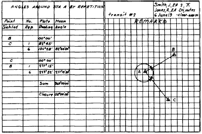 Figure 13-15.-Notes for the angle around a station, repeated six times. on the A vernier is about twice the size of the actual angle measured. The effect of this is to halve the total possible error. This error was originally plus or minus 30 sec. Now, the error is plus or minus only 15 sec.If you measure this angle a total of six times, the total possible error will be reduced to one-sixth of 30 see, or plus or minus 5 sec. In theory, you could go on repeating the angle and increasing the precision indefinitely. In actual practice, because of lost motion in the instrument and accidental errors, it is not necessary to repeat the angle more than six times.The observation may be taken alternately with the telescope plunged before each subsequent observation. But a much simpler way is to take the first half of the observations with the telescope in the normal position, the other half, in an inverted position. In the example given above, the first three readings may be taken when the telescope is in its normal position; the last three when it is in its reversed position. To avoid the effect of tripod twist, after each repetition, rotate the instrument on its lower motion in the same direction that it was turned during the measurement; that is, the direction of movement should always be either clockwise or counterclockwise. Measuring angles by repetition eliminates certain possible instrumental errors, such as those caused by eccentricity and by nonadjustment of the horizontal axis.Figure 13-15 shows field notes for the angle around a station, repeated six times. The angle BAC was measured six times, and the angle closing the horizon around station A was also measured six times. The first measurement is not a true repeat, but it is counted as one in the column headed "No. Rep." (number of repetitions).With the transit first trained on B and the zeros matched, the plate reading was 0000. This is recorded beside B in the column headed "Plate Reading." The upper motion clamp was then released, the telescope was trained on C, and a plate reading of 8245 was obtained. This reading is recorded next to the figure 1" (for "1st repetition") in the column headed "No. Rep." The measurement of angle BAC was then repeated five more times. After the final measurement, the plate reading was 13628. This plate reading is recorded as the sixth repetition.Now to get the mean angle, it is obvious that you need to divide some number, or figure, by the total number of repetitions. The question is, what figure? To determine this, you first multiply the initial measurement by the total number of repetitions. In this case, this would be as follows: