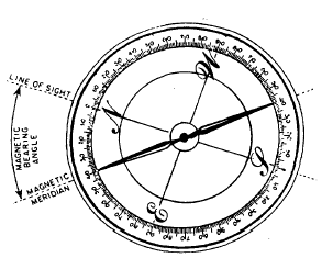 Figure 13-4.-A magnetic compass reading corrected for local attraction. observer is determining the magnetic bearing of the dotted line labeled Line of Sight. First, the observer mounts the compass on a steady support, levels it, and waits for the needle to stop oscillating. Then, the observer carefully rotates the compass until the north-south line on the card lies exactly along the line whose bearing is being taken. The bearing is now indicated by the needle-point. The needlepoint indicates a numerical value of 40. The card indicates the northeast quadrant. The magnetic bearing is, therefore, N40E. |