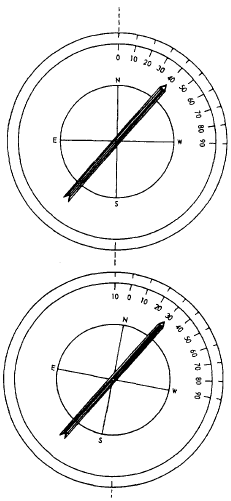 Figure 13-7.-Orienting a compass for a 10 easterly attraction. For example, with a compass affected by a 10W local attraction, you want to lay off a line bearing S28W magnetic by compass. If you were correcting, you would subtract a westerly attraction in the southwest quadrant. However, for uncorrecting you ADD a westerly attraction in that quadrant. Therefore, to lay off a line bearing S28W, you would lay off S38W by the compass.The same rule applies to azimuths. Suppose you have an azimuth-reading (measured from north) compass set up where local attraction is 10W and declination is 25E, and you want to lay off a line with true azimuth 256. The algebraic sum of these is 15E. For correcting or converting azimuths, you ADD easterly and SUBTRACT westerly corrections; therefore, if you were correcting or converting, you would add the 15 to 256. Because you are uncorrecting or unconverting, however, you subtract; and, to lay off a line with true azimuth 256, you read 241 by the compass.Orienting a Compass Some transit compasses and most surveyors and foresters field compasses are equipped for offsetting local attraction, local declination, and/or the algebraic sum of the two. In figure 13-7, the upper view shows a compass bearing of N40W on a compass presumed to be affected by a local attraction of 10E. In this quadrant, you subtract easterly attraction; therefore, the magnetic bearing should read N30W.In the lower view, the same compass has been oriented for an error of 10E by simply rotating the compass card 10E clockwise. On most orienting compasses, the card can be released for rotating by backing off a small screw on the face of the card. Note that you now read the correct magnetic bearing of N30W. |