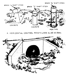 Figure 14-1.-Common types of bench mark construction and application.and are generally marked to show the elevation above sea level. When the elevation is not marked, you can find out what it is by contacting the government agency that originally set the BM. Just be sure you give them the same identification number as the one on the marker. The type of standard bronze markers used was discussed in chapter 11 of this training manual. BMs may be constructed in several ways. Figure 14-1, view A, shows brass shaft stocks in the tops of permanent horizontal control points (monuments). Sometimes, monuments of this type are also used for vertical control BMs. Original BMs may be constructed in the same manner. When regular BM disks are not available, brass, not steel, 50-caliber empty shell casings may be used. The shank of the empty shell casings should be drilled crosswise and a nail inserted to prevent its being pulled out or forced out by either expansion or contraction. For short lines and a level circuit of a limited area, any substantial object may be used for vertical control BMs. The remark in the field notes should bear the proper identification of the BMs used. Figure 14-1, view B, shows a mark like those commonly used on tops of concrete walls, foundations, and the like. Lines are chiseled out with a cold chisel or small star drill and then marked with paint or keel. The chiseled figures should be about the same size as the base area of the rod. Preferably, they should be placed on some high spot on the surface of the concrete structure. A spike may be driven into the root of a tree or placed higher up on the trunk of the tree when the limb clearance allows higher rod readings. Figure 14-2, view A, shows the recommended way to do this. The rod should be held on the highest edge of the spike, and the elevation should be marked on the blazed portion of the tree. Figure 14-2, view B, shows a spike driven on a pole or post that also represents a BM. Drive the spike in horizontally on the face of the post in line with the direction of the level line. For the reading, hold the rod on the uppermost edge of the spike. After the elevation has been figured, mark it on the pole or post for future reference. Stakes driven into the ground can also be used as TBMs, especially if no frost is expected before they are needed. A detailed description of these points is just as important as one for a monument station. In most permanent military installations, monument BMs are established in a grid system approximately one-half mile apart throughout the base to have a ready reference for elevations of later construction in the station. Generally, these BMs are fenced to mark their locations. The fence also serves to protect them from being accidentally disturbed. BM systems or level nets consist of a series of BMs that are established within a prescribed order of accuracy along closed circuits and are tied to a datum. These nets are adjusted by computations that minimize the effects of accidental errors and are identified as being of a specific order of accuracy. In certain areas, TIDAL BENCH MARKS must be established to obtain the starting datum plane or to check previously established elevations. Tidal bench marks are permanent BMs set on high ground and are tied to the tide station near the water surface. Tide stations are classified as primary and secondary. Primary stations require observations for periods of 19 yr or more to derive basic tidal data for a locality. Secondary stations are operated over a limited period (usually less than 1 yr) and for a specific purpose, such as checking elevations. The secondary station observations are always compared to, and computed from, data obtained by primary stations. A tide station is set up, and observations are made for a period that is determined by a desired accuracy. These observations are compared with a primary tide station in the area and, then, are furnished with a mean value of sea level in the area. A closed loop of spirit levels is run from the tide station over the tidal BMs and is tied back to the tide station. The accuracy of this level line must be the same as or higher than the accuracy required for the BMs. For permanency, tidal BMs usually are set in sets of three and away from the shoreline where natural activity or future construction probably will not disturb or destroy them. |