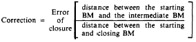 BM and recorded its correct elevation, as required. Then, you should check on the arithmetical accuracy with which you added BSs and subtracted FSs. The difference between the sum of the BSs taken on BMs or TPs and the sum of the FSs taken on BMs or TPs should equal the difference in elevation between the initial BM or TP and the final BM or TP.Balanced BS and FS distances are shown in figure 14-14. The distance used for the first instrument setup was 220 ft. The first BS (rod reading on El 35) was 6,659 ft. The first FS (rod reading on 0 16) was 4.971. Notice that the plus sign (+) appears at the top of the BS column and that the minus sign () appears at the top of the FS column in the field notebook. This helps you to remember that BSs are added and FSs are subtracted as you compute the new elevations. The BS taken on a point added to the elevation of the point gives the HI. This establishes the elevation of the line of sight so that an FS can then be taken on any point (BM, TBM, or TP). The level line is extended as far as desired with as many instrument setups as may be necessary by a repetition of the process used in the first setup.The elevation of El 35 is 133.163 ft. The first HI is133.163 + 6,659 = 139.822 ft. The FS subtracted from the HI, 139.822 4.971 = 134.851 ft, gives the elevation of 0, the first established. Following through with a similar computation for each setup, notice that the elevation of El 19 was found to be 136.457 ft.Look now at the notes in figure 14-14. The sum of all the BSs is 24.620 ft. The sum of all the FSs is 21.326 ft. The difference between the sum of the BSs and the sum of the FSs is 24.620 21.326 = 3.294 ft.This difference should agree with the difference between the actual elevation of BM 35 and the elevation already found for BM 19; that is, 136.457 133.163 = 3.294 ft.This provides a check on the step-by-step computation of elevations.ADJUSTMENT OF INTERMEDIATE BENCH MARK ELEVATIONS. Level lines that begin and end on points that have fixed elevations, such as BMs, are often called level circuits. When leveling is accomplished between two previously established BMs or over a loop that closes back on the starting point, the elevation determined for the final BM will seldom be equal to its previously established elevation. The difference between these two elevations for the same BM is known as the ERROR OF CLOSURE. The Remarks column of figure 14-14 indicates that the actual elevation of BM 19 is known to be 136.442 ft. The elevation found through differential leveling was 136.457 ft. The error of closure of the level circuit is136.457 136.442 = 0.015 ft. It is assumed that errors have occurred progressively along the line over which the leveling was done so that adjustments for these errors are distributed proportionally along the line as shown by the following example: Referring to figure 14-14, you will notice that the total distance between BM 35 and BM 19, over which the line of levels was run, was 2,140 ft. The elevation on the closing BM 19 was found to be 0.015 ft greater than its known elevation. You must therefore adjust the elevations found for the intermediateTBMs 16, 17, and 18. The amount of correction is calculated as follows: