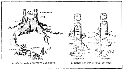 Figure 14-2.-Ways of using spikes as bench marks.