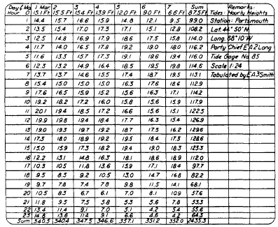 Figure 14-3.Sample format showing hourly heights of tide required for computing average mean sea level (MSL). shown in figure 14-3. The heights on this form are added both horizontally and vertically. The total sum covering 7 days of record is entered in the lower right-hand corner of the page. The mean for each calendar month is found by combining all daily sums for the month and dividing by the total number of hours in the month. The monthly mean, to two decimal places, is entered on the sheet that includes the record for the last day of the month. Yearly means are determined from the monthly means, and a mean is taken of all yearly means for the period of record. Three or more years of record should be used for a good determination of sea level. The actual value varies somewhat from place to place, but this variation is small. The station used for MSL determinations should be on the open coast or on the shore of bays or harbors having free access to the sea. Stations on tidal rivers at some distance from the open sea will have a MEAN RIVER LEVEL that is higher than mean sea level because of the river slope. It should be noted that mean sea level is NOT identical with mean tide level (MTL). The latter is derived from the mean of all high and low points on the tidal curve. But MSL is derived from the mean of a much larger number of points taken at hourly intervals along the tidal curve.The datum universally used in leveling is mean sea level (MSL), and it is considered to be the zero unit. The vertical distance of a given point above or below this datum then becomes the elevation of that point. Other Datums Along the Atlantic coast of the United States, the mean low water (MLW) datum has been generally adopted as the datum used for hydrographic surveys. It is the mean of all low water tides observed over a long period (usually a 19-yr period). Mean lower low water (MLLW) has been generalIy adopted for hydrographic surveys along the Pacific coast of the United States, Hawaii, Alaska, and the Philippine Islands. It is the mean of the lower of the two low water tides for each day observed over a long period. Mean low water spring (MLWS) is used on the Pacific coast of the Panama Canal Zone. It is defined as the mean of the low waters of the spring tides occurring a day or two after a full moon and is obtained by subtracting one-half of the range of the spring tides from the mean sea tide level. |
