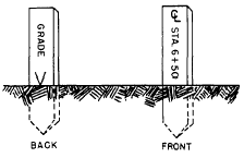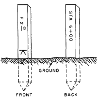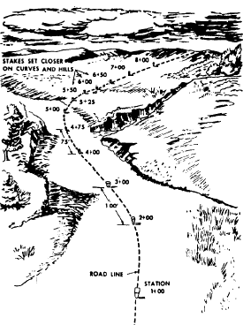 of the pavement. In rough grading, the equipment operators are usually guided by grade stakes that are set along the center line by the transit-tape survey party at center-line stations. The center-line stations (stakes) are usually set at intervals of 100 ft or more on straight-line stretches and intervals of 50 ft or less on roads with horizontal and vertical curvatures. On a small-radius, street-corner curve, a center-line hub or stake might be set at the center of the circle of which the curve is a part. This is done so the construction crew may outline the curve by swinging the radius with the tape. Reference stakes or hubs are also set on one or both sides of the center line to permit reestablishment of the center line at any time.Each center-line stake is marked with the vertical depth of cut or fill required to bring the surface to grade elevation. The surveyor must indicate the station markings and the cut and fill directions on stakes. Lets look at the stakes on the center line of the road-building job. The starting point is the first station in the survey;
