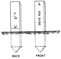 Figure 14-32.-Station markings. this station is numbered 0 + 00. The next station is normally 100 ft farther and is marked 1 + 00; the third station is another 100 ft farther and is marked 2 + 00; and so on. On sharp curves on rough ground, the stakes may be closer together. (See fig. 14-32.) Generally, the station markings face the starting point. The mark ~, which is also on the side facing the starting point, is used to indicate that the stake is a center-line stake.A cut is designated by the letter C, and the fill is indicated by the letter F. Numerals follow the letters to indicate the amount that the ground should be cut or filled. The symbol C 13 indicates that the existing ground should be cut 1.5 ft, as measured from the reference mark. During rough grading, the cut and fill are generally carried just up to the nearest half foot; exact grade elevations are later marked with hubs (blue tops). The mark Y is called a crowfoot. The apex of the V indicates the direction of the required change in elevation; so a cut is indicated by Y , and a fill is indicated by fi . In some cases, surveyors mark the grade stake only with a negative or a positive number and the crowfoot, indicating the cut or fill.