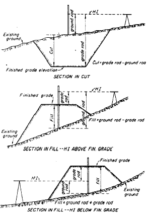 as follows: 1. From BMs, turn levels on the center-line hubs or on the ground next to a grade stake at each station.2. Reduce the notes to obtain hub-top or ground elevation.3. Obtain the finished grade elevation for each station from the construction plans.4. Compute the difference between finished grade and the hub or ground elevation to determine the cut or fill at each station.5. Go back down the line and mark the cut or fill on each grade stake or guard stake. The elevations and the cuts or fills may be recorded in the level notes, or they may be set down on a construction sheet, as explained later in this chapter. Another procedure may be used that combines the method listed above so that the computations may be completed while at each station; then the cut or fill can be marked on the stake immediately. As before, levels are run from BMs; the procedure at each station is as follows: 1. Determine the ground elevation of the station from the level notes to obtain HI. 2. Obtain the finished grade for the station from the plans.