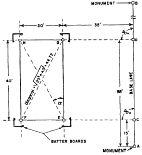 Figure 14-39.-Building stakeout. stakeout. This site plan shows that the building is to be a 40- by 20-ft rectangular structure, located with one of the long sides parallel to, and 35 ft away from, a base line. The base line is indicated at the site and on the plans by Monuments A and B.One of the short sides of the building will lie on a line running from C, a point on AB 15 ft from A, perpendicular to AB, The other short side will lie on a similar line running from D, a point on AB 40 ft from C and, therefore, 40 + 15, or 55 ft from A, perpendicular to AB.The steps in the stakeout procedure would probably be as follows:1. Set up the transit at Monument A; train the telescope on a marker held on a Monument B; then have the hubs driven on the line of sight, one at C 15 ft from A, the other at D 55 ft from A and 40 ft from C.2. Shift the transit to C, train on B, match the zeros, and turn 900 left. Measure off 35 ft from C on the line of sight and drive a stake to locate E. Measure off 55 ft from C (or 20 ft from E) and drive another stake to locate F.3. Shift the transit to D and repeat the procedure described in Step 2 to locate and stake points G and H.THE ACCURACY OF A RECTANGULAR STAKEOUT CAN BE CHECKED BY MEASURING THE DIAGONALS OF THE RECTANGLE.The diagonals should, of course, be equal. You can determine what the correct length of each diagonal should be by applying the Pythagorean theorem, as shown in figure 14-39. For a large rectangle, checking the accuracy of the stakeout by angular measurement with the transit may be more convenient. For example: You can determine the correct size of angle GEH, (lets call it a) in figure 14-39 by a convenient right-triangle solution, such as