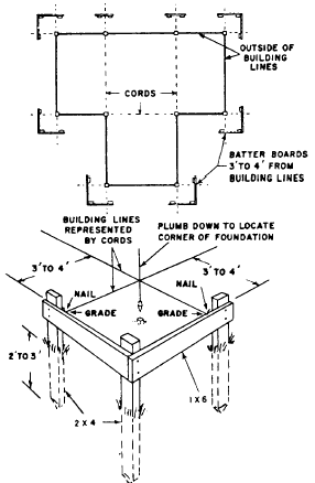 The corresponding angles at the other three corners should have the same dimensions. If the sizes as actually measured vary at any corner, the stakeout is inaccurate. Remembering the angles may be necessary to obtain the correct angular precision for the lengths of the lines being checked. BATTER BOARDS are suitable marks placed for use as References or guides during the initial excavation and rough grading of a building construction and/or a sewer line stakeout. They are more or less temporary devices that support the stretched cords that mark the outline and grade of the structure. Batter boards consist of 2- by 4-in. stakes driven into the ground. Each stake has a crosspiece of 1- by 6-in. lumber nailed to it. The