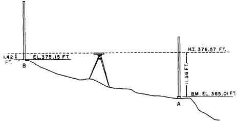 PROCEDURE Now that you have learned how to setup and level the engineers level and how to read the leveling rod, let us take a look at an example that will explain the basic procedure of determining elevations during a leveling operation.In figure 14-11, there is a BM at Point A with a known elevation of 365.01 ft. You wish to determine the elevation of a point on the ground at Point B. To do so, you first set up and level your engineers level approximately half-way between Points A and B. When the instrument is leveled properly, you will have a perfectly level line of sight that can be rotated all around the horizon.The next thing to do is to determine the elevation of this line of sight. This elevation is called the HEIGHT OF INSTRUMENT, familiarly known as the HI. To obtain this elevation, the instrumentman takes a backsight (BS) on a leveling rod held on the BM and, in this example, obtains a rod reading of 11.65 ft. The HI, then, is the BM elevation PLUS the rod reading, or 365.01 + 11.56, which equals 376.57 ft. This means that no matter to which direction the telescope is trained, any point around the horizon that is intercepted by the horizontal cross hair has an elevation of 376.57 ft.To determine the ground elevation at Point B, the instrumentman now takes a foresight (FS) on a rod held at Point B. This time, a rod reading of 1.42 ft is read. Since the elevation of the line of sight (HI) is 376.57 ft, obviously the ground elevation at Point B is the HI MINUS the rod reading, or 376.57 1.42, which equals 375.15 ft.Balancing Shots The balancing of the FS and BS distances is important in leveling. The effeet of curvature and refraction may be eliminated by a balanced BS and FS distance; however, instrumental error is a far more important reason for careful balancing.