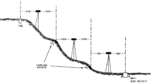 Figure 14-12.-Turning points. "Balancing shots" means equalizing as much possible BS and FS distances by selecting turning points that are approximately an equal distance from both the BS and FS points. No matter how carefully you level a level telescope, it is likely to be still slightly out of the horizontal. The error this causes increases with the length of the sight taken. If the BS distance differs from the FS distance, the BS and FS errors will also differ. If the distances are the same, the errors will be the same. Balancing shots therefore eliminates the effect of instrumental error and also of curvature and refraction, other errors that increase with distance.To balance distances for a setup, you will find that using the same number of paces for BS as for FS is helpful. In general, BS and FS distances should be kept under 300 ft except when necessary to pass or cross an obstacle. |