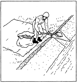 Figure 15-7.-Taking a composite sample from a small windrow. in drawing the soil profile, and in estimating the physical properties of soils encountered in the field.Generally, 100 g of soil is enough to determine the moisture content of fine-grained soils. Larger samples are required for soils that contain gravel. Normally, moisture content samples are placed in metal dishes (canisters) that have tight-fitting covers; however, any other clean container that can be adequately sealed may be used. When the moisture content test is to be per-formed within 1 day after the sample is