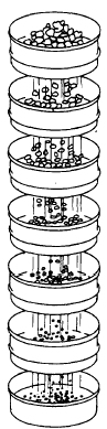 Figure 15-29.-Varying sieve sizes. 3. Place three scoops (24 g) of reagent in the cap. Then, with the pressure vessel in a horizontal position, insert the cap into the pressure vessel and tighten the clamp to seal the cap to the unit. 4. Raise the moisture tester to a vertical position so that the reagent falls into the vessel.5. Hold the moisture tester horizontally; vigorously shake the device with a rotating motion for 10 sec to put the steel balls into orbit around the inside circumference; then rest for 20 sec. Repeat the shake-rest cycle for a total of 3 min. Do not allow the steel balls to fall against either the cap or orifice leading to the dial; this may cause damage.6. Holding the tester horizontally at eye level, read and record the dial reading as the percent of moisture by wet mass.7. When the sample is dumped, examine it for lumps. If the soil sample is not completely broken down, increase the time limit (shaking unit) by 1 min on the next test.8. To determine the percentage of moisture by dry mass (ovendry moisture percentage), read the direct reading obtained in No. 6 above into a calibration curve that is also supplied with the test set. |
