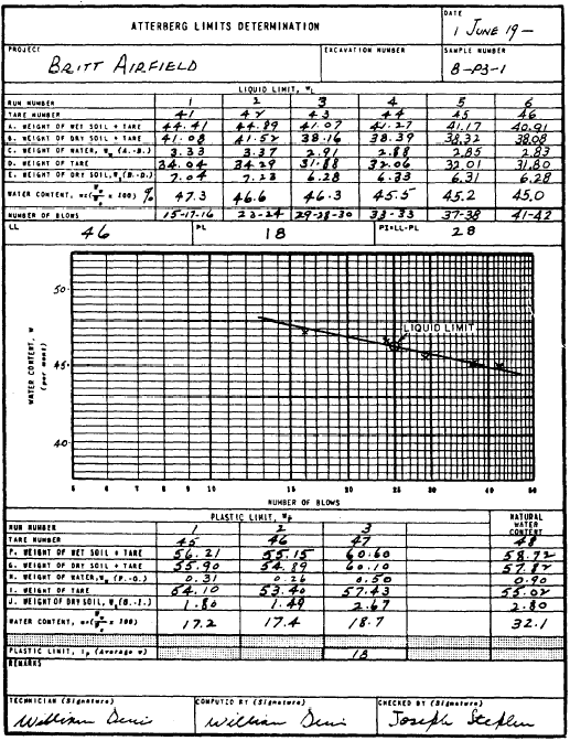 Figure 15-37.-Data sheet, Atterberg limits determination. dish and thoroughly mix it with distilled water, adding water until the soil mass becomes plas- tic enough to be shaped into a ball easily. Take a portion of the ball weighing about 8 g for the sample. |