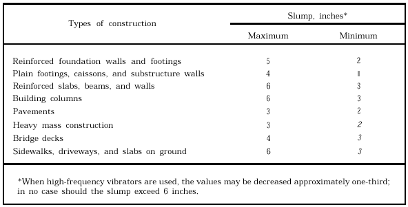 Table 15-4.-Recommended Slumps for Various Types of Construction gradation; specific gravity, absorption, and surface moisture; impurities, such as organic material, clay, or other water-absorbing particles; and soundness, which is the property of an aggregate to resist disintegration due to freezing and thawing. Although these tests are not included in this TRAMAN, you may refer to NAVFAC MO-330, Materials Testing, should you desire to learn more about them. |