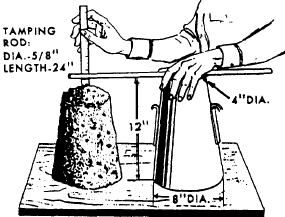 Figure 15-41.-Measurement of slump. in subsidence of the concrete below the top edge of the cone, add additional concrete to keep an excess of concrete above the top of the cone at all times. After the top layer has been rodded, strike the surface of the concrete off flush by means of a screeding and rolling motion of the tamping rod. Immediately remove the slump cone from the sample by carefully and steadily lifting it straight up at the rate of 5 2 sec for the height of the cone. Place the cone next to the test specimen. At this point, the entire test from the start of filling the cone to completing the removal of the cone should not exceed 2 1/2 min. In measuring the slump, first place the tamping rod across the top of the cone so that it extends over the test specimen as shown in figure 15-41. Next, measure the vertical distance from the bottom of the rod to the average height of the subsided concrete specimen.This measurement is known as the SLUMP. If a decided falling away or shearing off of concrete from one side or portion of the specimen mass has occurred, disregard the slump measurement and make a new test on another portion of the sample. If two consecutive tests show a falling away or shearing off, the concrete probably lacks the necessary plasticity and cohesiveness for the slump test to be applicable.After measuring and recording the slump, you have completed the slump test. As a supplementary procedure, however, tap the sides of the specimen gently with the tamping rod. The reaction of the concrete indicates its cohesiveness and workability. A well proportioned, workable mix gradually slumps to lower elevations and retains its original identity. A poor mix crumbles, segregates, and falls apart.If the slump testis performed for a trial batch during concrete mix design, then too little, or too much, slump indicates the need for a new trial batch with revised ingredient proportions. When the test is performed as a quality control mea-sure for a construction project, the slump obtained by testing will be compared to the specified slump for the concrete used for that particular project. If too little, or too much, slump has been determined by the test, then the quality control inspector, or other appropriate authority, will determine whether to accept or reject the concrete. |