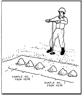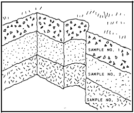 TAGGING SAMPLES Let us suppose that soil in a given area is to be tested (such as the area on which a structure is to be erected). The officer in charge of soil exploration decides how many points are needed and where they must be located to produce a representative test of the soil in the area. This information is recorded in a sketch like the one shown in figure 15-3.This figure shows the locations of exploratory points along a highway, the point locations referenced by the center-line station and the distance from the center line. To the left of the center line, between stations 2 + 80 and 4 + 60, there is a borrow pit, from which soil for fill is taken. The soil here is tested by samples taken from a 60-ft trench (T1), located at station 3 + 20, 300 ft from the highway center line; from two borings (B1 and B2) at stations 3 + 60 and 3 + 80, 230 ft and 420 ft from the center line, respectively; and from a 20-ft- square pit (P2) at station 4 + 20, 300 ft from the center line.Besides the borrow pit exploration, there is a boring (B3) at station 4 + 80, 125 ft to the right of the center line; another boring (B4) at station 6 + 00, 100 ft to the left of the center line; and a 20-ft-square pit (P3) on the center line at station 7 + 20.Each sample taken is tagged according to the location from which it was taken. Locations are given in consecutive numbers; for those shown in figure 15-3, the numbers might run from the bottom up, with T1 being No. 1; B 1, No. 2; and so on. A sample is tagged with the project symbol (the symbol for the project shown in fig. 15-3 is BF) and the location symbol (such as T1 or B1). If more than one sample is taken from the same location, you need to use additional numbers. For example, a sample taken from B2 in figure 15-3 maybe tagged BF-B2-4, "boring No. 2, location No. 4, the first of 6 bag 1 of 6." This means taken from that location."The sample identification is printed with a marking pencil or pen on two tags, one of which is placed inside the bag, and the other of which is tied on the outside. Gummed labels may be similarly used to identify samples that are placed in moisture content boxes, cylinders, or jars.DISTURBED SAMPLES Samples taken by hand scoops, auger borings, shovels, or any other convenient hand tool with no attempt to obtain the material in its natural state of structure or density is known as a DISTURBED sample. These samples are used for mechanical analysis, plasticity, specific gravity, frost susceptibility, compaction, and laboratory compacted CBR tests. The size of the sample taken will depend upon the tests to be performed.Individual Samples When taking individual samples from a pit, trench, or exposed face (fig. 15-4), first shave off loose and dried soil to obtain a fresh surface and to expose any soil variations clearly. Then take a typical sample of each type of soil or of those requiring additional investigation. When sampling in auger holes, place typical portions of the soil obtained