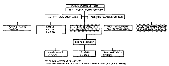 Works Department SEABEEs receiving orders to a shore or overseas shore activity other than a SEABEE staff or school command are normally assigned to the public works department (PWD) of the activity. EAs assigned to PWDs may fill several different types of billets, depending on the organization of the department and the capabilities of the EAs assigned. Although most PWD jobs are filled by civilians, military billets do exist to implement rotation of Occupational Field 13 personnel from sea to shore duty. Most of the EA public works billets are in the engineering division, where the EA works hand in hand with civil service personnel in performing drafting and/or surveying tasks. Senior EAs with planning and estimating or inspecting experience may be assigned to the facilities management engineering division to work as planners and estimators or maintenance inspectors. Sometimes when there is a shortage of senior military personnel in the facilities management engineering division, EAs and other Occupational Field 13 petty officers are trained for planning and estimating or maintenance inspecting.A unique situation exists at most public works departments. Your military duties and responsibilities will fall under military supervision, whereas your professional work will be directly supervised by a civilian engineer. Adjusting to this situation may be difficult at first, but as an alert EA, you will benefit from the vast experience of the professional civilian engineer. A good working relationship between you and your civilian co-worker is of the utmost importance. Once this relationship is established, duty at a public works department becomes interesting and rewarding. The basic organization for a public works department is shown in figure 16-2.ENGINEERING DIVISION. The public works engineering division (fig. 16-2) is responsible for all matters pertaining to engineering studies and reports, including preliminary designs and estimates for special repair and improvement projects; for engineering design, including development of plans and specifications; and for the maintenance of technical plan files and records. This division is responsible for preparation of shore facilities development reports and for the submission of basic data required by the NAVFAC engineering field division director for preliminary engineering studies.