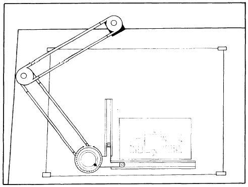 Figure 2-33.-Drafting machine with rigid arms. have the bands without the tubes). If these bands become loose through wear or expansion, the tension can be increased on them. This type of drafting machine is superior to that with pin-point linkage because there is less lost motion. To learn more about other tools and their uses, refer to chapter 1 of the field manual FM 5-553, General Drafting, published by the Headquarters, Department of the Army, and other civilian publications.