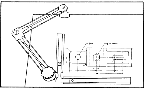 OTHER TOOLS Many tools other than the ones already presented in this chapter are currently used to help create technical drawings. A variety of drafting machines (not in the draftsman kit) are available at several shore-based support activities. Dependent upon the requirements of that particular activity, an EA assigned to staff or independent duty may also be exposed to a more advanced and sophisticated computer-assisted drafting method.The standard drafting machine combines the functions of a parallel ruler, protractor, scales, and triangles. Various drafting operations requiring straight and parallel lines may be performed advantageously with a drafting machine. The majority of drafting machines are constructed so that the protractor head may be moved over the surface of a drafting table without change in orientation by means of a parallel-motion linkage consisting of two sets of double bars. Figure 2-33 shows a rigid metal connecting link or arms, commonly called pin-joint linkage. Another type of drafting machine has two steel bands enclosed in tubes working against one another (fig. 2-34) (although this type may also
