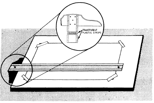 Figure 2-8.-Parallel straightedge. Turn the T square over and redraw the line with the same edge. If the blade is warped, the lines will not coincide. If the blade swings when the head is held firmly against the edge of the drawing board, the blade may be loose where it is joined to the head, or the edge of the T square head may be warped. You can usually tighten a loose blade by adjusting the screws that connect it to the head, but if it is out of square, warped, or in bad condition, you should select a new T square. PARALLEL STRAIGHTEDGE Many draftsmen prefer to use a PARALLEL STRAIGHTEDGE (fig. 2-8) rather than a T square. The primary purpose of the parallel straightedge is the same as the T square. The parallel straightedge is a laminated maple blade with transparent plastic edges similar to those on the T square. The parallel straightedge uses a system of cords and pulleys so that it is supported at both ends by a cord tacked to the drawing board. You can move the straightedge up or down the board with pressure at any point along its length and maintain parallel motion automatically. It comes complete with cord, tacks, cord tension adjuster, and mounting instructions. Some straightedges, like the one shown in figure 2-8, are equipped with a cord lock on one end of the blade. The straightedge is locked into place by turning the cord lock clockwise. This permits use of the straightedge on an inclined board. It also prevents accidental movement when you are inking or using mechanical lettering devices. The advantages of the parallel straight-edge become particularly significant when you are working on large drawings. While the T square works well for small work, it becomes unwieldy and inaccurate when you are working on the far right-hand side of large drawings. |