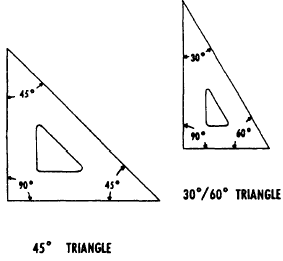 Figure 2-9.-Steel straightedge. straightedge is also excellent for trimming blueprints and cutting heavy illustration board. Steel straightedges are usually made of stainless steel and are available in lengths of 15 in. to 72 in. The one included in the draftsman kit is 42 in. long. Some have a beveled edge, like the one shown in figure 2-9. TRIANGLES TRIANGLES are used in combination with the T square or straightedge to draw vertical and inclined lines. They are usually made of transparent plastic, which allows you to see your work underneath the triangles. Triangles are referred to by the size of their acute angles. Figure 2-10 shows two basic drafting triangles: the 45 (each acute angle measures 45, and the 30/60 (one acute angle measures 30; the other, 60). The size of a 45 triangle is designated by the length of the sides that form the right angle (the sides are equal). The size of a 30/60 triangle is designated by the length of the longest side that forms the right angle. Sizes of both types of triangles range from 4 in. through 18 in. in 2-in. increments. Like all other drafting equipment, triangles must be kept in good condition. If plastic triangles are dropped, their tips may be damaged. Also, triangles may warp so that they do not lie flat on the drawing surface, or the edge may deviate from true straightness. To prevent warping or