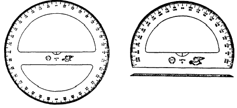 Figure 2-12.-Types of protractors. Protractors used by the EA are usually graduated in increments of 1/2. By careful estimation, angles of 1/4 may be obtained. Protractor numbering arrangement varies. Semicircular protractors are generally labeled from 0 to 180 in both directions. Circular protractors may be labeled from 0 to 360 (both clockwise and counterclockwise), or they may be labeled from 0 to 90 in four quadrants. Protractors should be stowed and cared for in the same manner as triangles. |